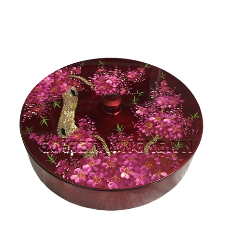 - 01 Hộp Mứt Sơn Mài Tròn Φ30cm - Vẽ hoa đào Tím & nền đỏ