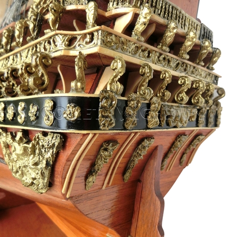 - Đế tàu bằng gỗ sơn màu đen, phía trên có đính kèm bảng tên đồng "SOLEIL ROYAL"