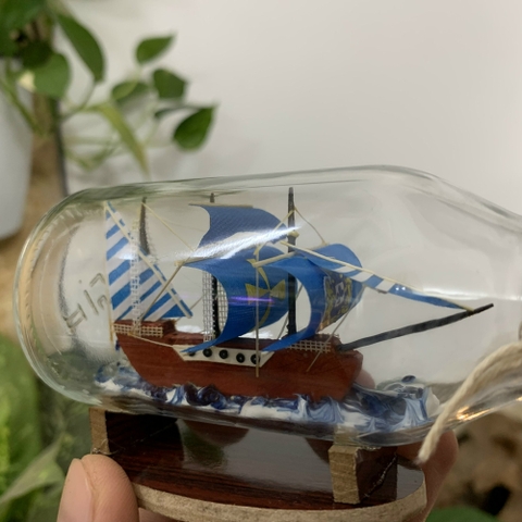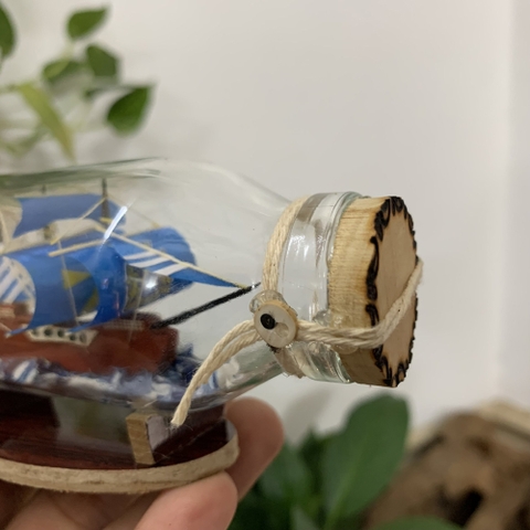 + 01 Mô hình thuyền gỗ trang trí trong chai thủy tinh - Buồm màu xanh - Dài 11cm