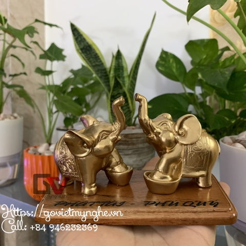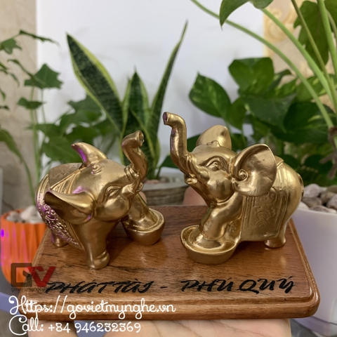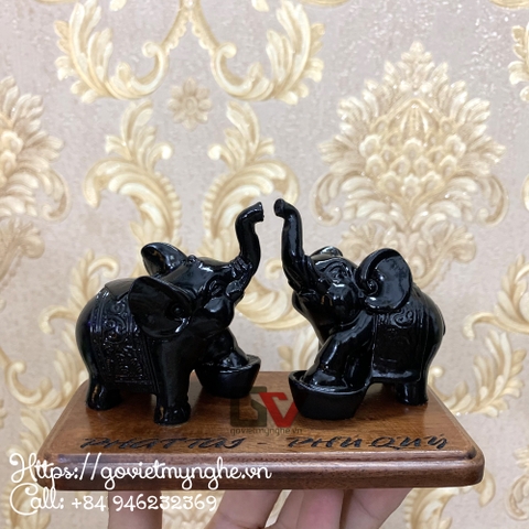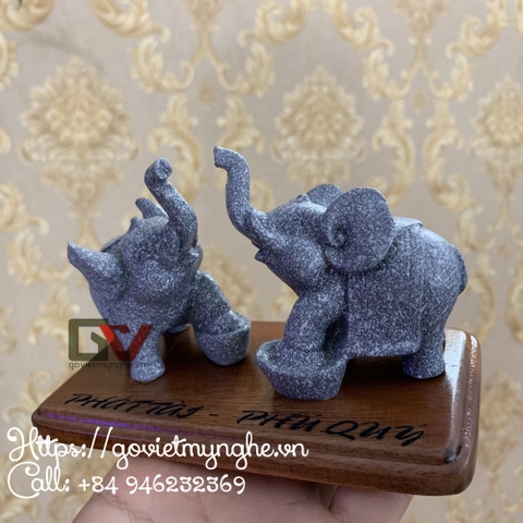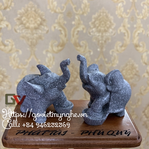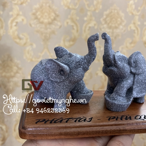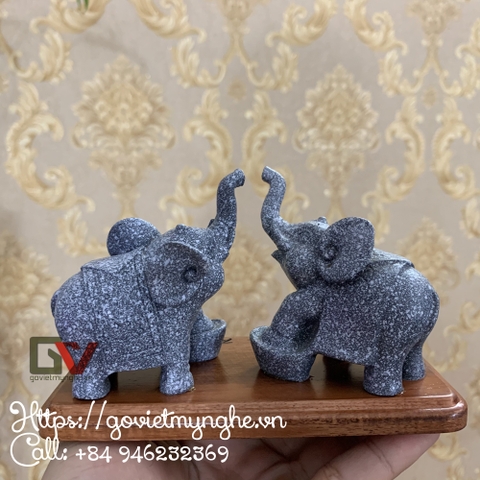 Combo 2 Tượng voi đá trang trí phong thủy dáng voi đạp thỏi vàng chiêu giữ tài lộc - Đế gỗ