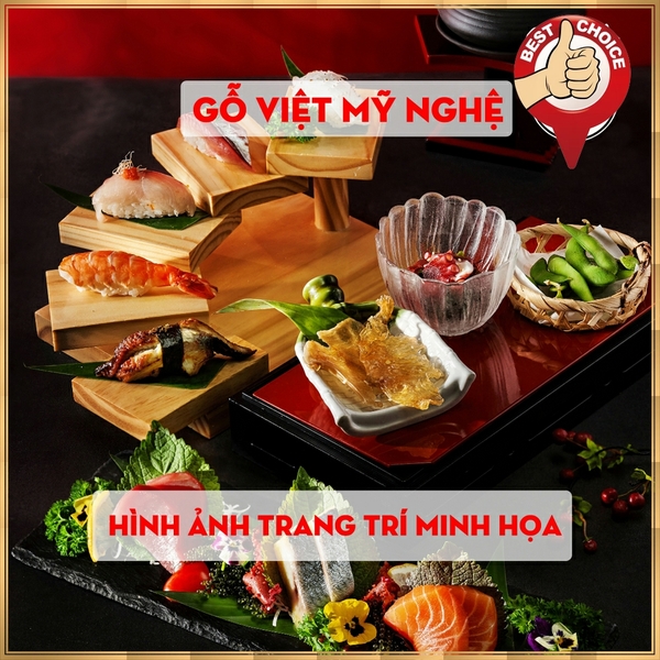 + Khay gỗ bậc thang được dùng để trang trí Sushi trong phong cách trang trí ẩm thực Nhật Bản.