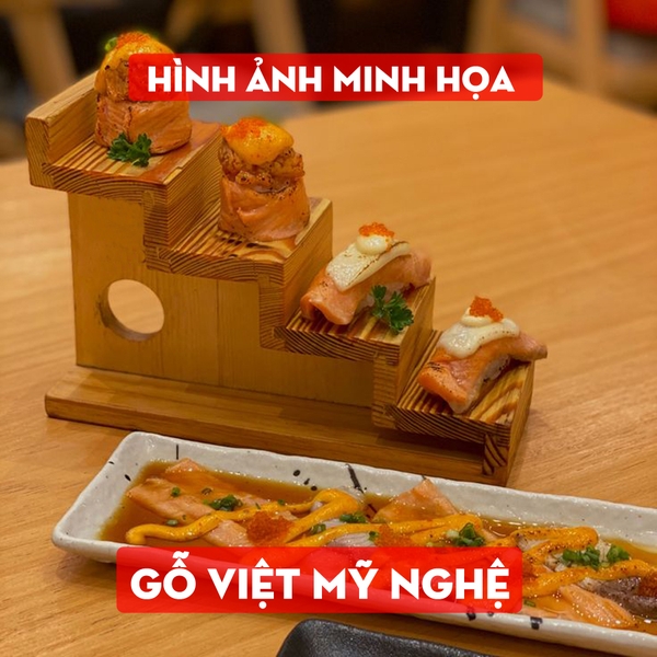 + Khay gỗ bậc thang được dùng để trang trí Sushi Sashimi trong phong cách trang trí ẩm thực Nhật Bản.