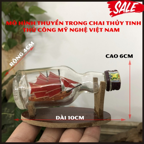 + 01 Mô hình thuyền gỗ trang trí trong chai thủy tinh - Buồm đỏ - Dài 10cm