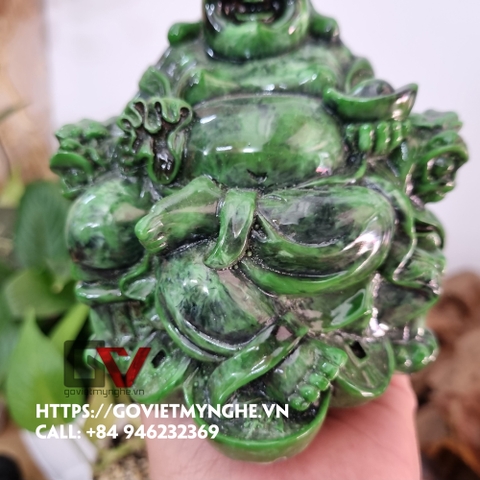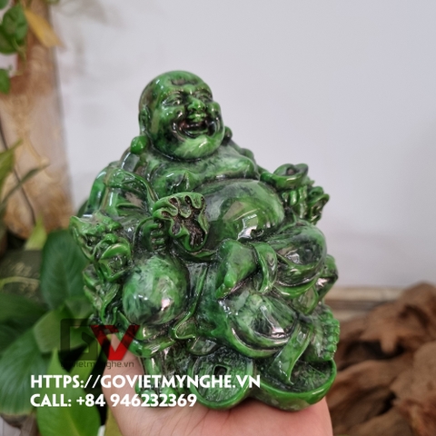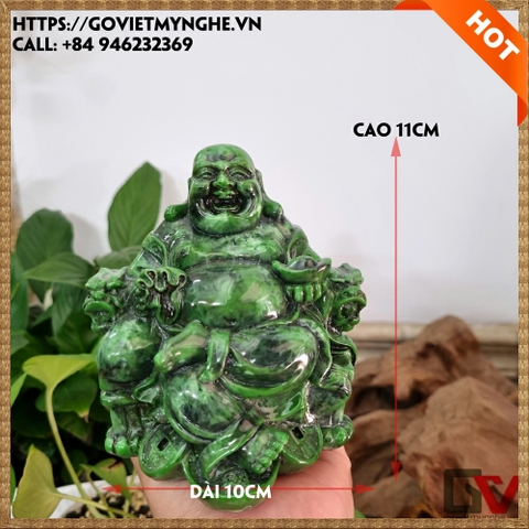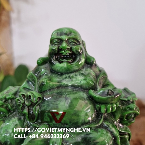 Tượng đá trang trí tượng Phật Di Lặc ngồi trên ghế vàng cầm vàng - Cao 11cm - Xanh lục bích