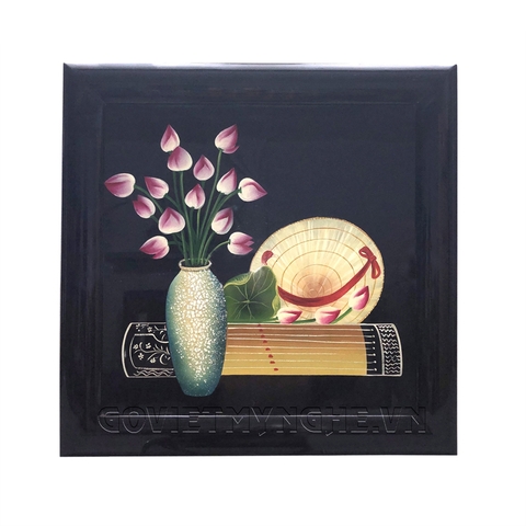 + 01 Tranh Sơn Mài Tĩnh Vật - Hoa Sen & Đàn Tranh - 40x40cm