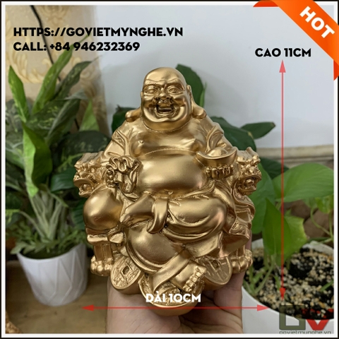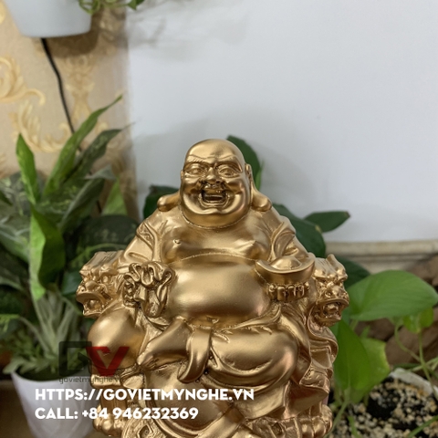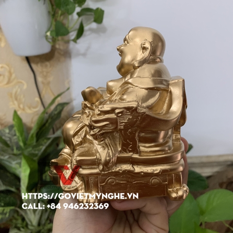 Tượng đá trang trí tượng Phật Di Lặc ngồi trên ghế vàng cầm vàng - Cao 11cm - Nhũ đồng