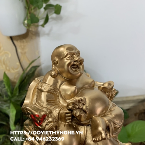 + 01 Tượng đá trang trí tượng Phật Di Lặc ngồi trên ghế vàng cầm vàng - Cao 11cm - Nhũ đồng