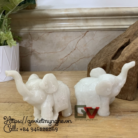 Tượng voi đá trang trí phong thủy dáng voi đạp thỏi vàng chiêu giữ tài lộc - Cao 11cm - Màu Trắng đá non nước